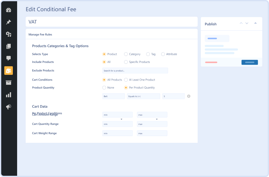 Optimize your customersâ shopping experience by charging fees based on their roles, products, categories, shipping options, and cart conditions with remarkable extra fees for the WooCommerce plugin.